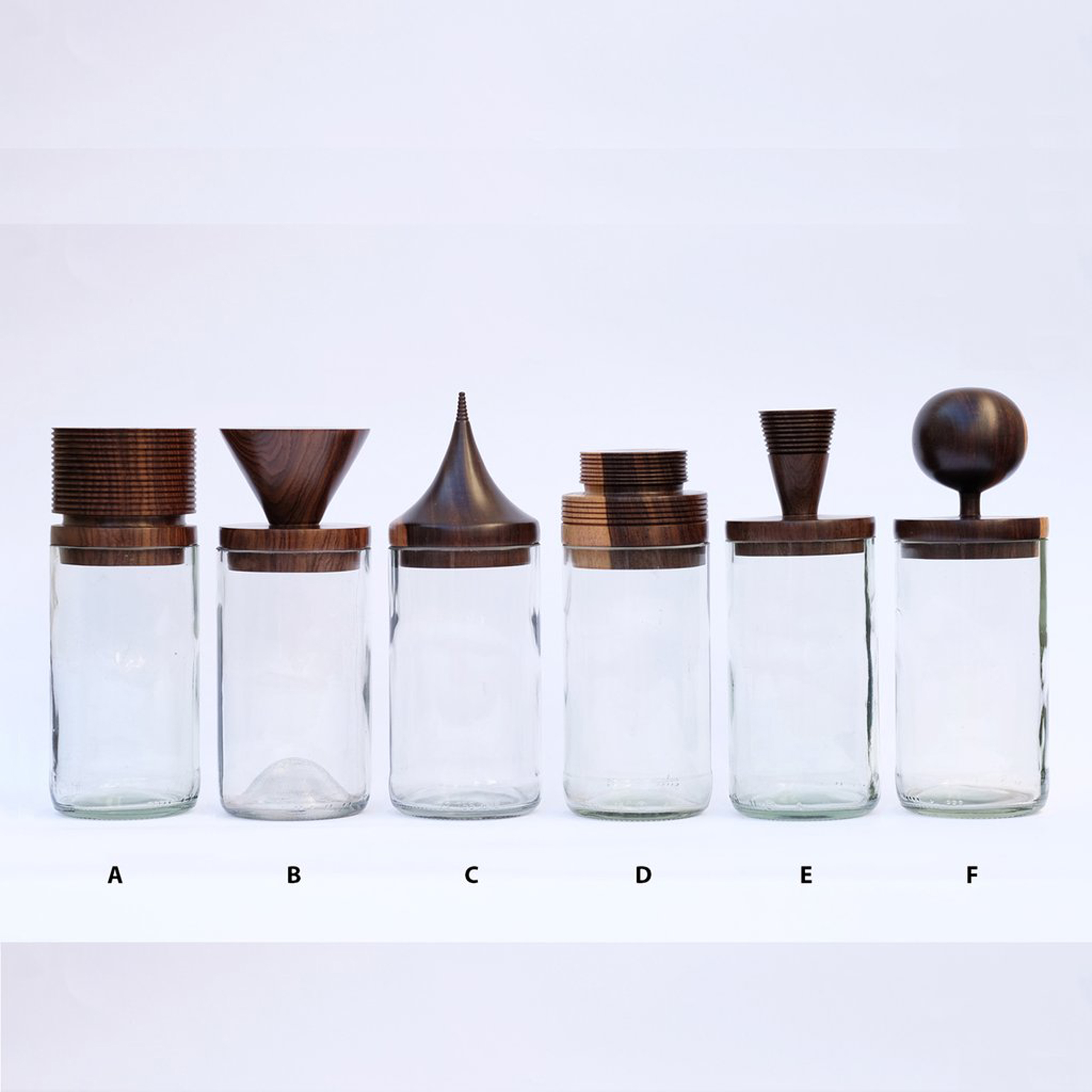 Upcycled wine bottles (jars), mahogany wood (lids)