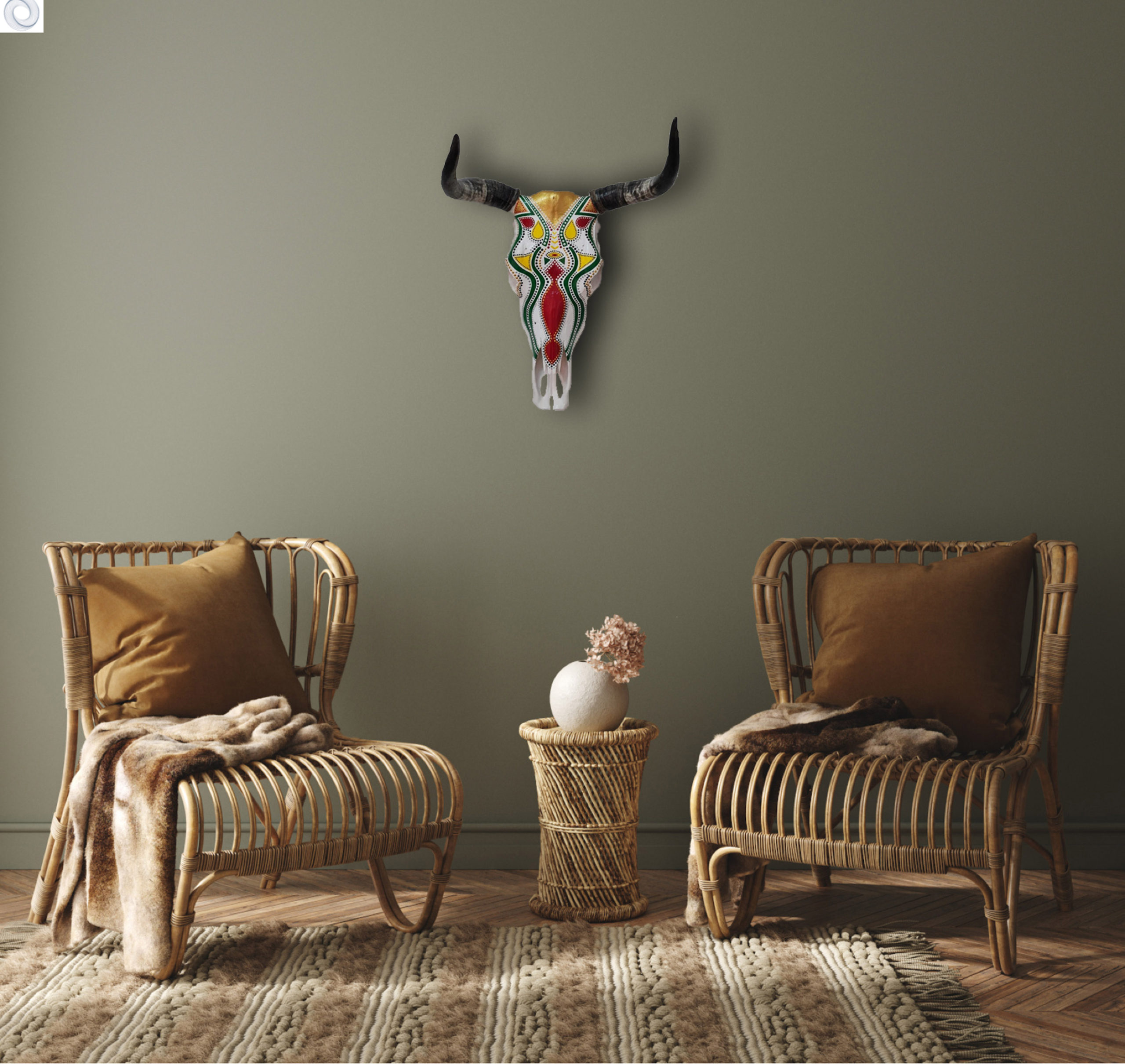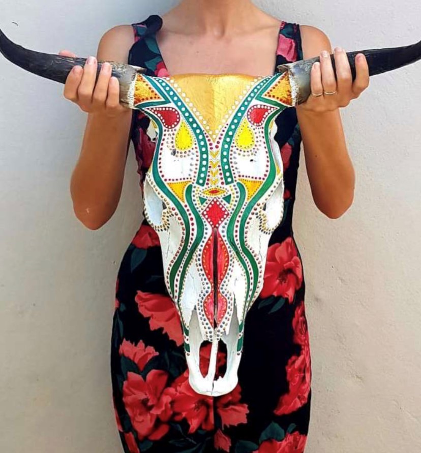 Jacqueline Chantler is a creative artist who lives along the idyllic Garden Route on the coast of South Africa. Jacqueline has always had a passion for creating beauty, often transforming disused materials into meaningful reflections of life and art. Inspired by African, Spanish and diverse cultural art whilst traveling through in Europe, the Middle East and South East Asia; Jacqueline creates all her masterpieces by hand, using various hand paint techniques, colours and styles. Her sought after pieces transform living spaces, inside or out. Inspired by the natural beauty of the African farmlands surrounding George, Jacqueline’s passion to create art and beauty, coupled with her heritage, resulted into her transforming these traditional cattle skulls into works of art.